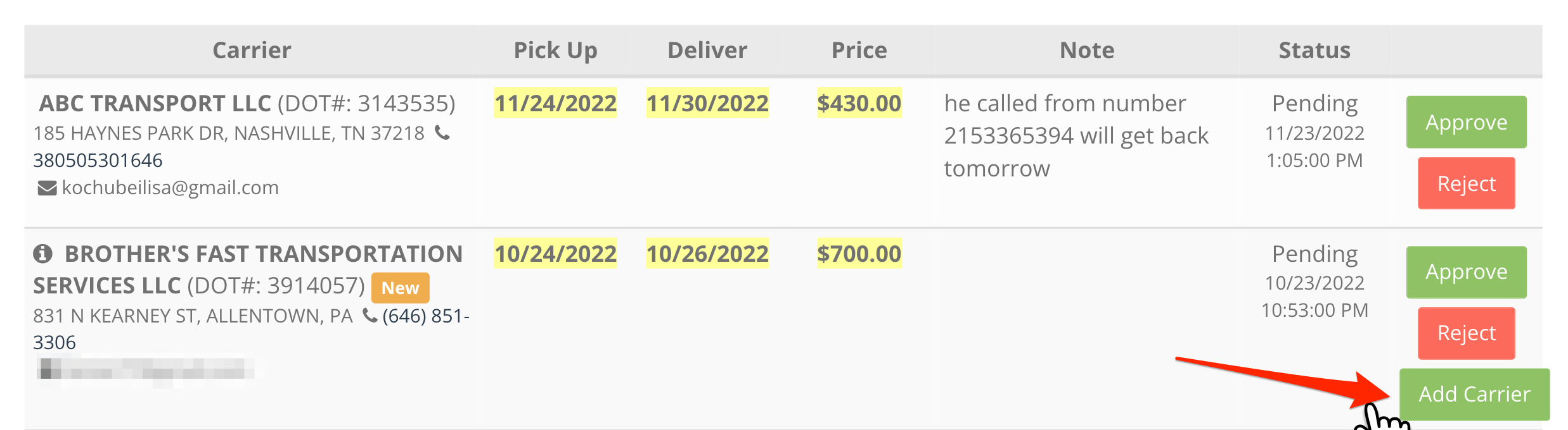 4. If you see the Pick Up/Delivery dates or Price marked in yellow it means that the carrier made some changes when requested the job.