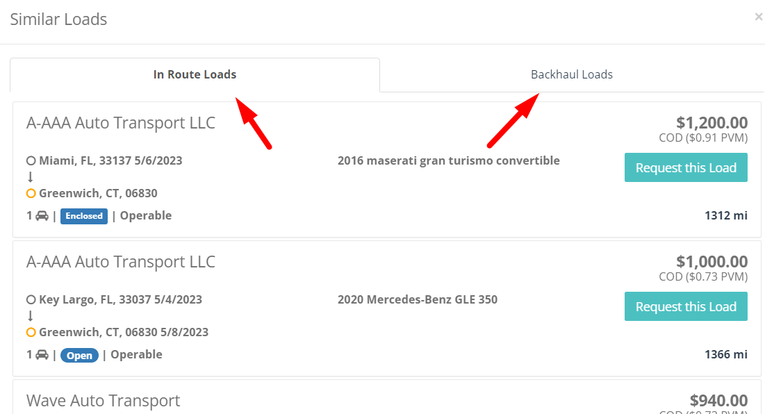 Now you can check all the available In Route/Backhaul loads by clicking on the View button next to the load in your account and the system will show you the Notification if there are any In Route/Backhaul loads on a MarketPlace.