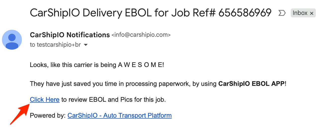 If carrier used CarShipIO App and delivered the job by signing the eBOL, you will receive an email notification about it to your home email: